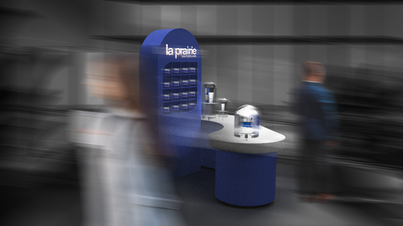 Inspired by La Prairie's iconic packaging silhouettes, this retail desk embodies the Swiss brand sophistication. Crafted from premium materials like marble, stainless steel and frosted glass, it features sleek lines and subtle nods to the brand's cobalt blue and metallic accents. Strategic displays and curved volumes, offer both functionality and visual satisfaction for customers. Lighting features travelling through the frosted blue glass panels, set a captivating ambiance, inviting customers to indulge in personalised experiences on the go.
